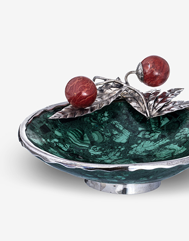 Descrição: Taça em malaquite com prata e bolas de coral vermelho.