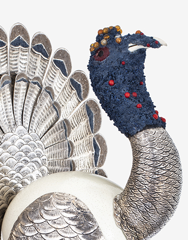 Descrição: Peru em prata em ovo de avestruz, pescoço em coral azul, coberto com pedras diversas e olhos em granadas. Medidas: Comprimento: 20 cm Largura: 33,5 cm Altura: 39 cm #BZPD16