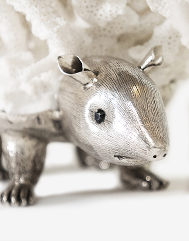 Descrição: Ouriços cacheiros em prata e coral branco com olhos em granadas.