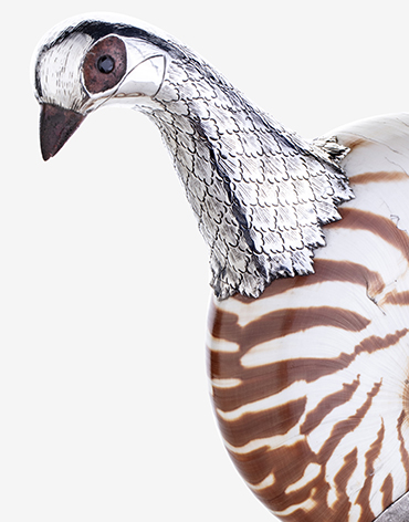 Descrição:Perdizes em prata, em concha de nautilus pompilius (18 cm) com os olhos em coral e granadas. Bico em coral vermelho.