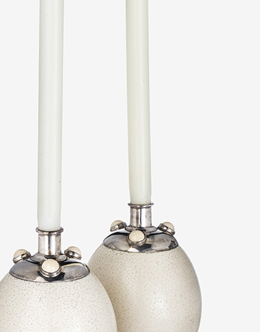 Descrição: Par de castiçais em ovo de avestruz e prata.