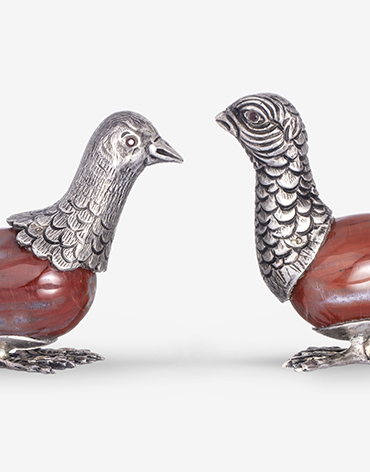 Descrição: Pombinhas de prata em ovo de pedra com olhos em granadas.