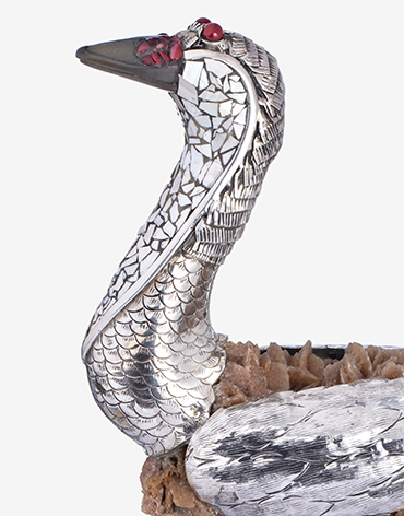 Patos em prata. Corpo em rosa do deserto. Pescoço em prata e pedaços de nautilus partidos, bico de osso em coral vermelho. Olhos em coral vermelho.
