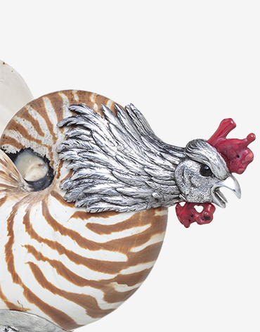 Galo em Prata em concha de " nautilus pompilius" (18cm), crista de coral vermelho. Olhos em granadas.