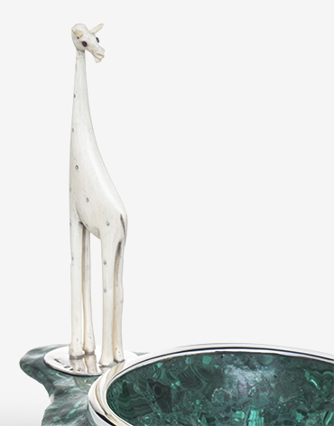 Taça em malaquite com prata (925) , girafa em marfim e bolinhas em prata. Olhos em granadas.