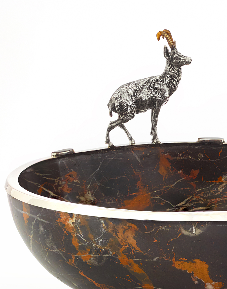 Taça em mármore com veado em prata (925), olhos em granadas. Cabochons em tartaruga.