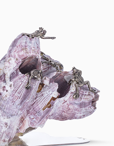 Descrição: Centro de mesa em prata e "Balanus Perforatus" com sapos e olhos em granadas.